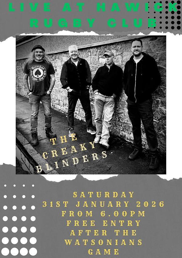 After our final home game, next Saturday 31st January, we have The Creaky Blinders” playing in the club room after the Man-of-the-Match presentation at 6pm. FREE ENTRY after the game.